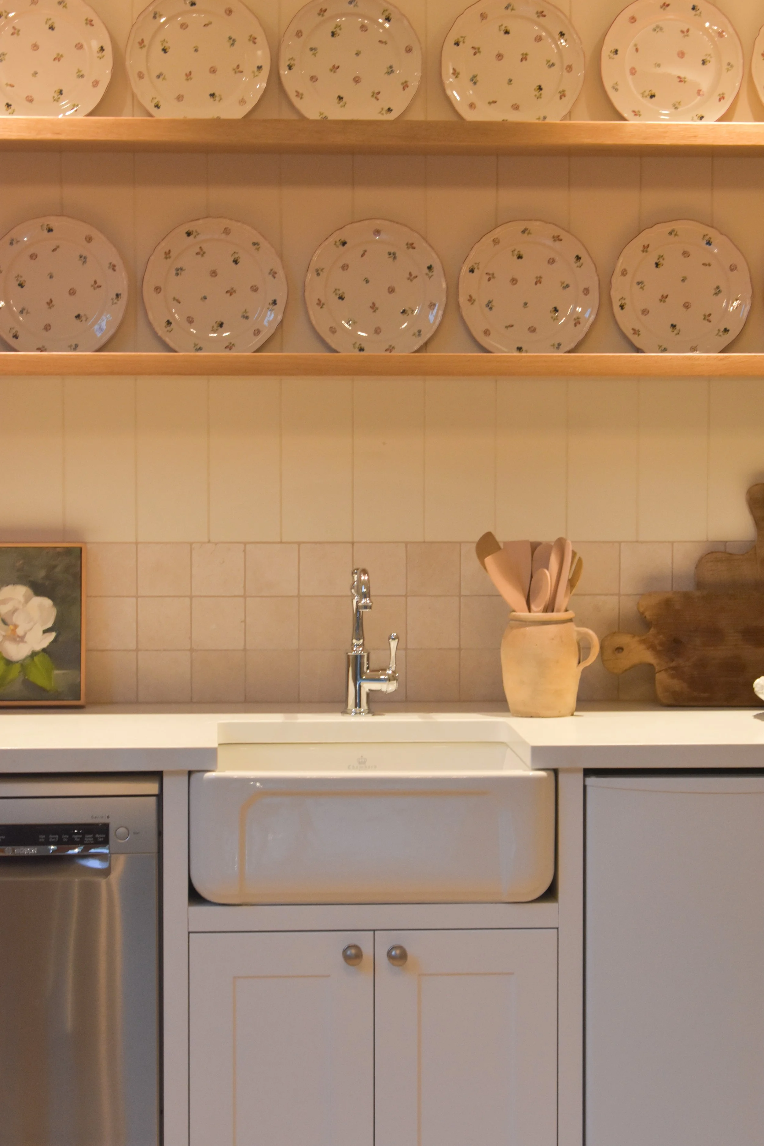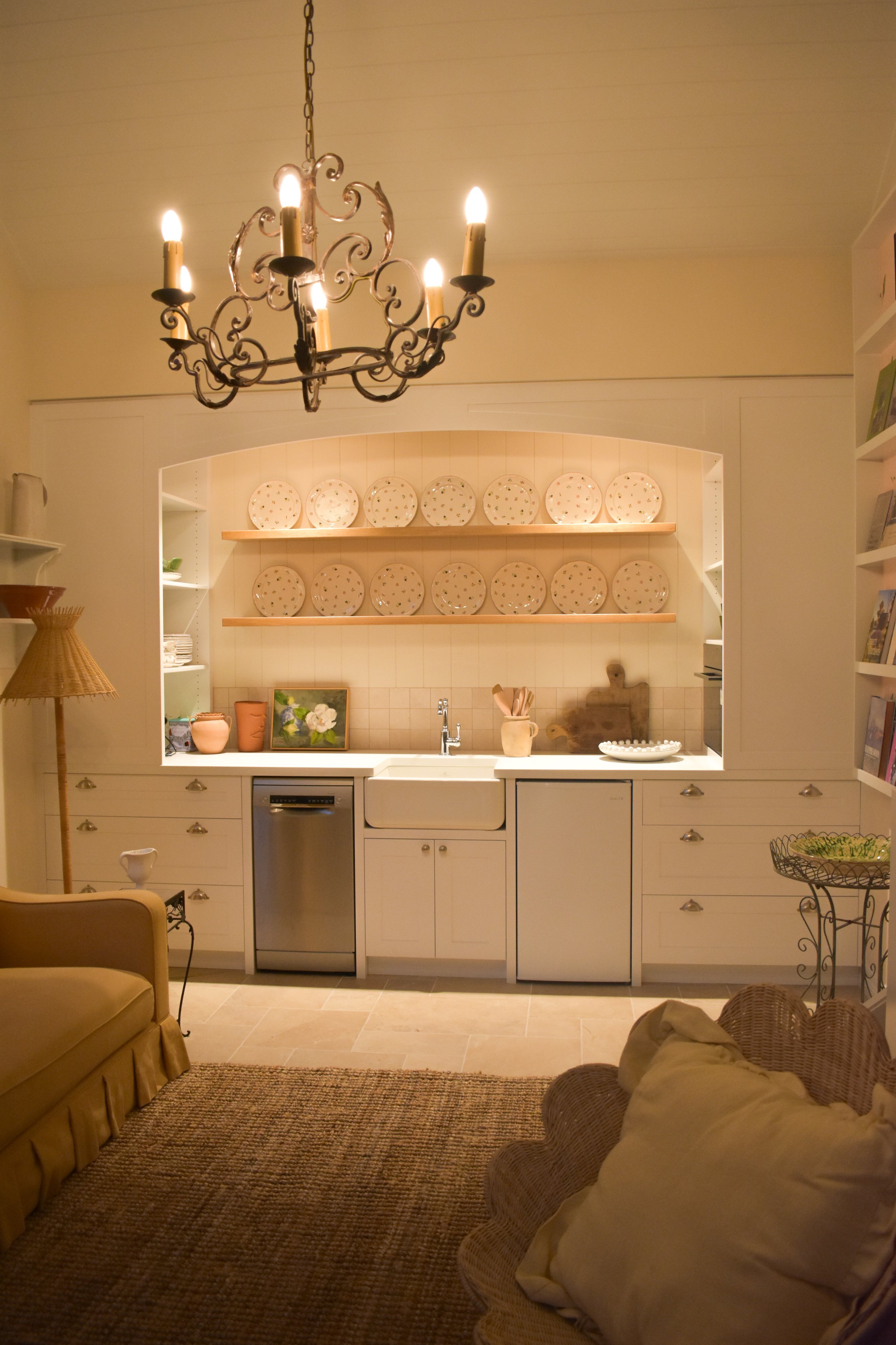 The bathroom features marble tiles, underfloor heating, and an openable skylight with an integrated rain sensor to maximise natural light and ventilation. Underfloor heating was also installed throughout the kitchenette, with French pattern tiles selected to continue seamlessly from the interior through to the adjoining patio, strengthening the indoor outdoor connection.
