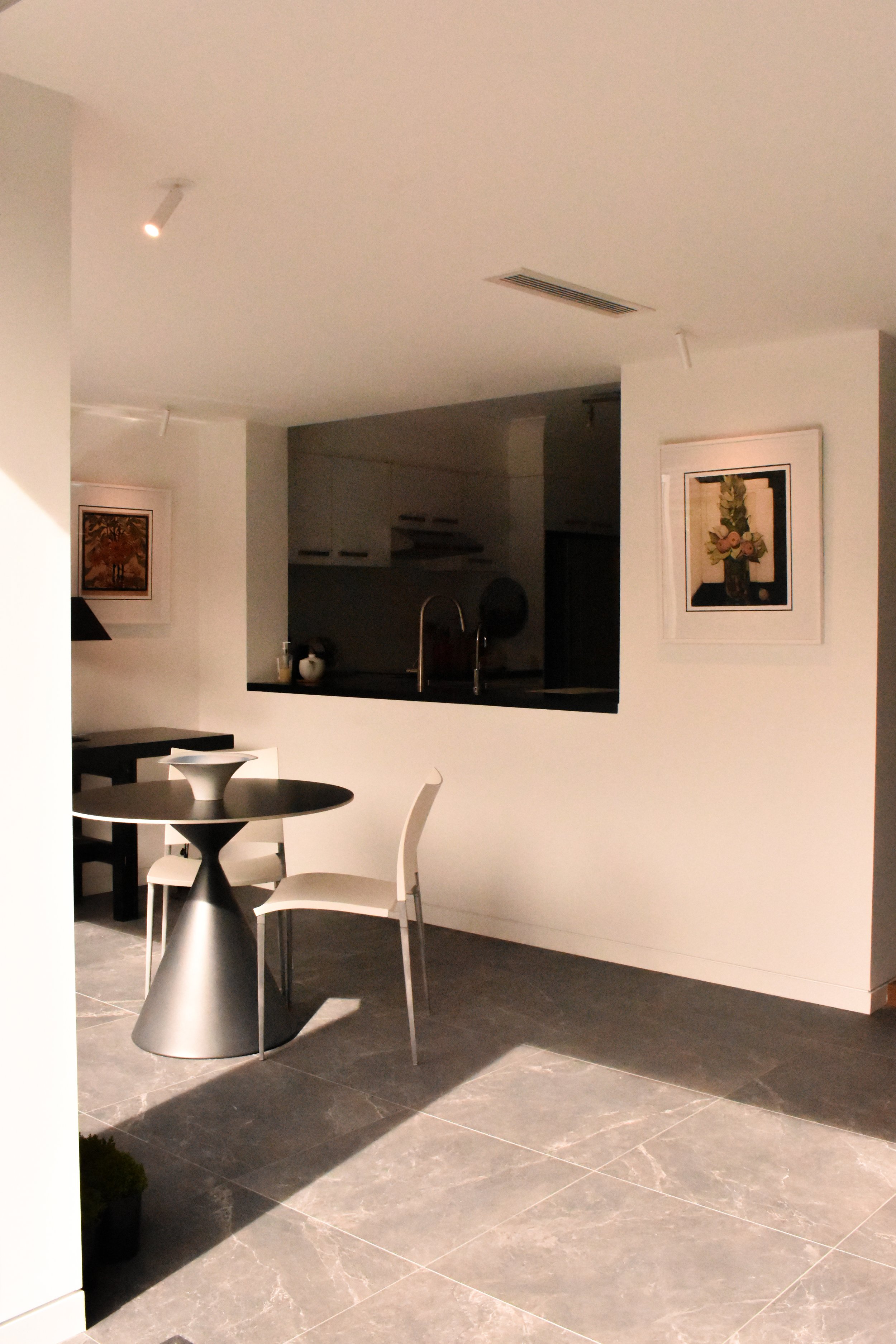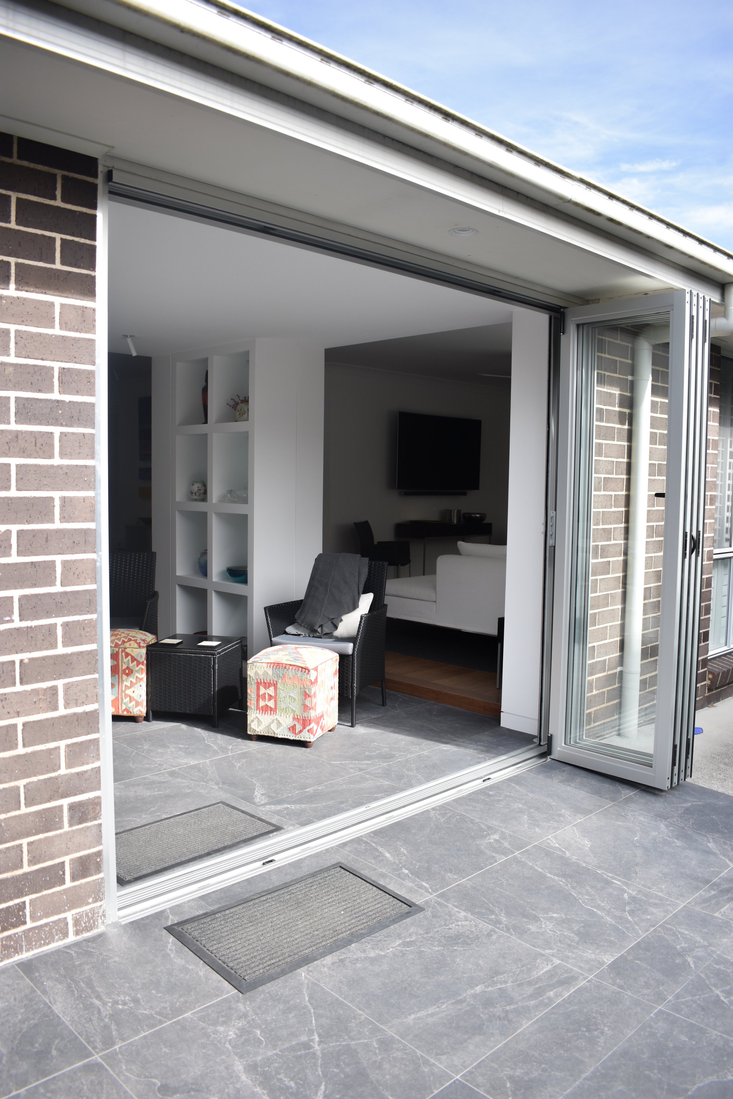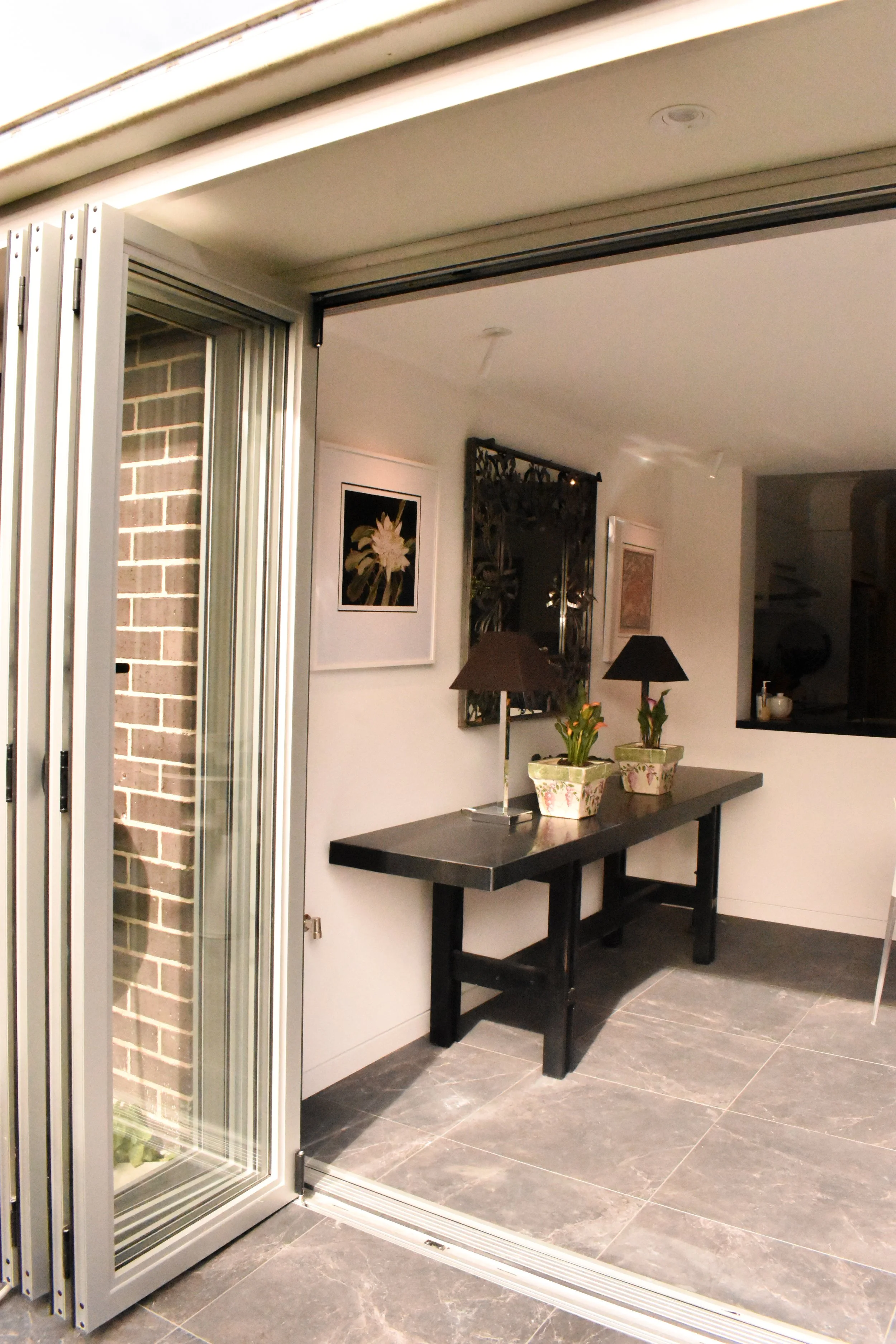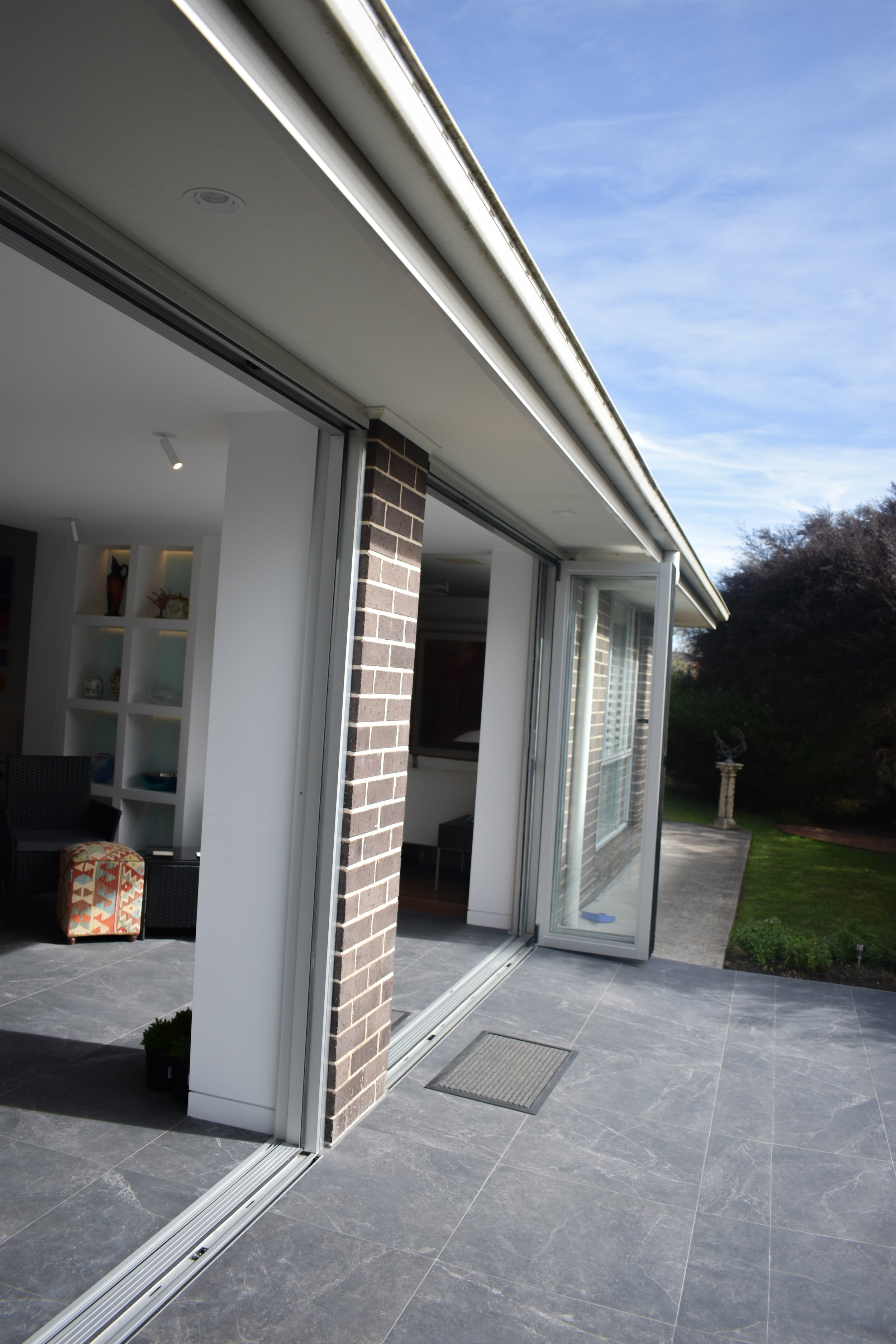 Inside, a custom built-in shelving unit was designed with hidden strip lighting, providing a functional and visually striking feature. Retractable flyscreens were installed flush with the floor, allowing doors to remain fully open during summer while maintaining a clean, uninterrupted aesthetic. To further enhance natural light, three skylights were added to the existing kitchen, bringing sunlight deep into the living areas and creating a bright, inviting atmosphere.